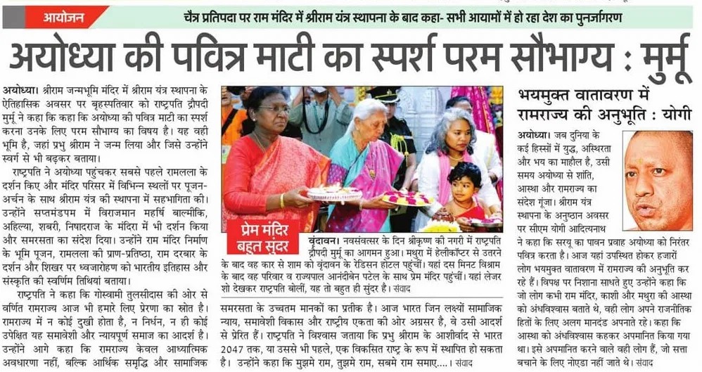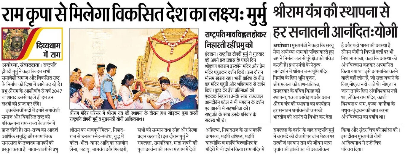 सकल आस्था के प्रतिमान रघुनन्दन प्रभु श्रीराम की जन्मस्थली धर्मनगरी श्रीअयोध्या जी की पावन भूमि पर श्रीरामलला के भव्य और दिव्य मंदिर की स्थापना की प्रक्रिया गतिमान है।